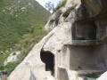 古崖居前区面积最大,但损坏的程度也最严重。整个山体看去,坍塌的部分使石窟从中剖开,内部结构和布局一目了然,特别是那些原在石窟内连接上一层,现已坍塌的残留石阶,看的更是一清二楚。在一幢相通的两居室和三居室,可以看那些修凿有回龙弯道的火炕,和设施齐全的厨房及卧室,抚摸那光滑笔直的墙壁,站在堂屋伸臂测量顶高,寻找古人在此居住时的真实感觉,体会西奚民族的生活习性和方式,探讨先人们修建防御工事和民居建筑的思路,令人感慨万分。